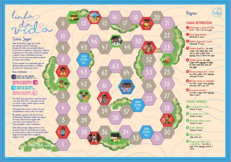 O Linha da Vida é um divertido jogo de tabuleiro, inspirado no Jogo da Glória, com casas de avanço e recuo, que simultaneamente sensibiliza os jogadores para as desigualdades de género, que representam obstáculos enormes e muito evidentes no percurso escolar das raparigas de comunidades escolares apoiadas pela Helpo, em Moçambique.